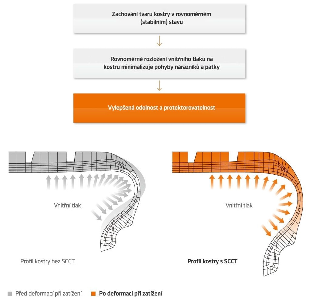 Technologia SCCT jest zaprojektowana w celu zachowania stabilnego kształtu deformacji szkieletu. Jeśli nie można utrzymać stałego kształtu szkieletu, siły działające wewnątrz szkieletu będą skoncentrowane w jednym specyficznym miejscu (na krawędzi pasów zderzakowych lub zakończeniu owijanych kordów nad drutem stopki). Natomiast technologia SCCT kontroluje równomierność rozkładu wewnętrznego ciśnienia w celu poprawy ogólnej odporności i trwałości szkieletu. SCCT pozwala firmie Hankook Tire rozwijać opony o zrównoważonej sztywności, powierzchni styku, ulepszonych właściwościach, bezpieczeństwie i sterowności podczas jazdy w zakrętach, hamowania, osiągach, trwałości i odporności.